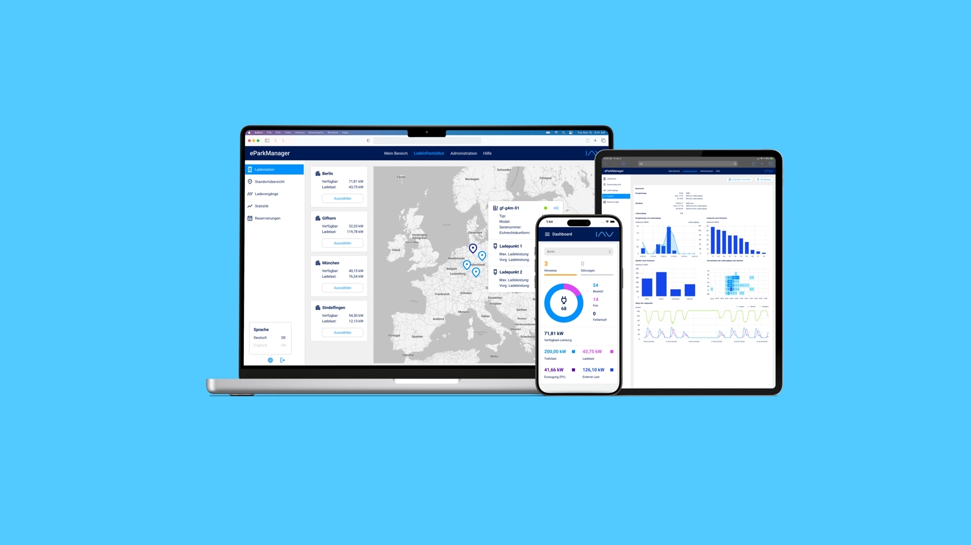 Egal, ob es um einzelne Ladepunkte oder um einen umfangreichen Ladepark mit zahlreichen Stationen an verschiedenen Standorten geht – mit dem eParkManager lassen sich diese effizient verwalten, konfigurieren und steuern.